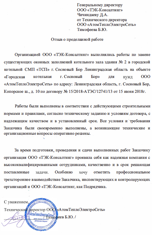 OOO «TEK-Consulting» выполняла работы по замене существующих оконных заполнений котельного зала здания № 2 в городской котельной СМП «ТСП» на объекте «Городская котельная г. Сосновый Бор» для нужд ООО «АтомТеплоЭлектроСеть» по адресу: Ленинградская область, г. Сосновый Бор, Копорское ш., д. 10.