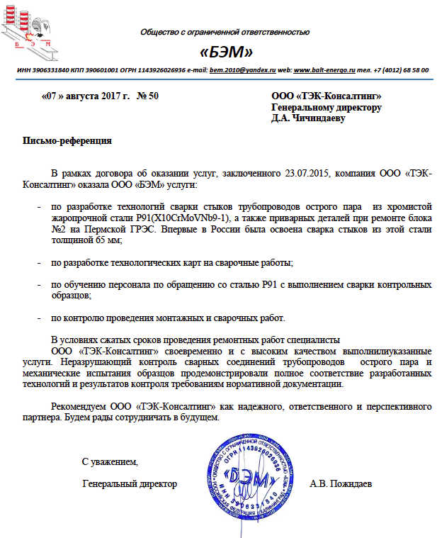 Для ООО «БЭМ» возникла необходимость разработки технологий сварки стыков трубопроводов острого пара из хромистой жаропрочной стали P91(X10CrMoVNb9-1), технологических карт на сварочные работы, а так же по обучению персонала по обращению со сталью Р91 с выполнением сварки контрольных образцов. В условиях сжатых сроков проведения ремонтных работ специалисты ООО «ТЭК-Консалтинг» своевременно и с высоким качеством выполнили указанные услуги. Неразрушающий контроль сварных соединений трубопроводов острого пара и механические испытания образцов продемонстрировали полное соответствие разработанных технологий и результатов контроля требованиям нормативной документации.